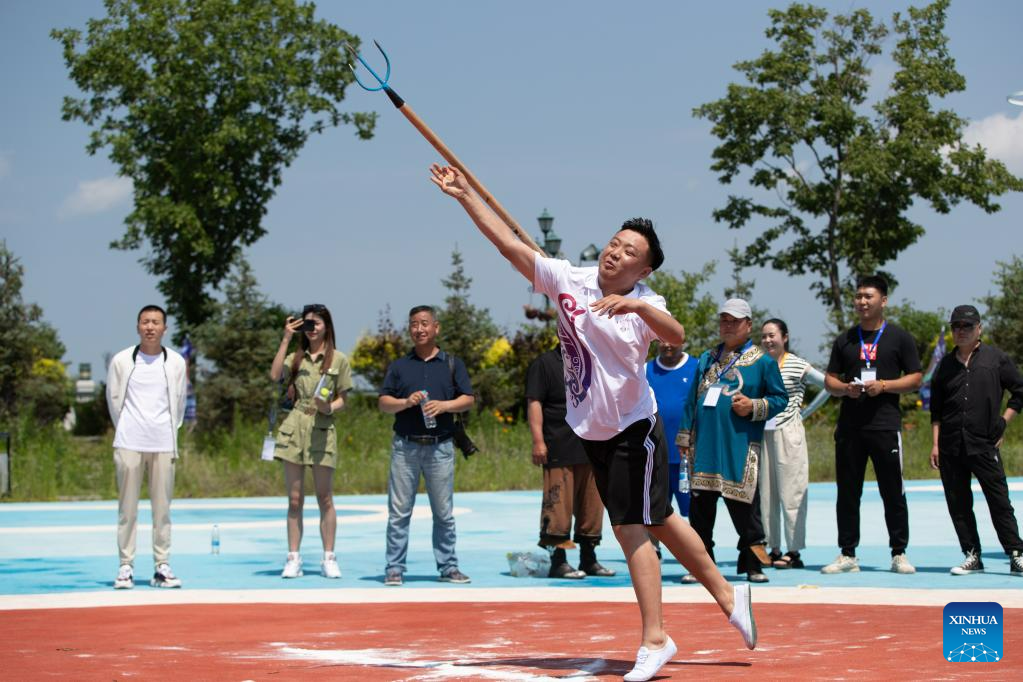 A Hezhe contestant takes part in a competition during the 11th Wurigong Festival of the Hezhe ethnic group in Fuyuan, northeast China's Heilongjiang Province, July 2, 2023. (Xinhua/Zhang Tao)