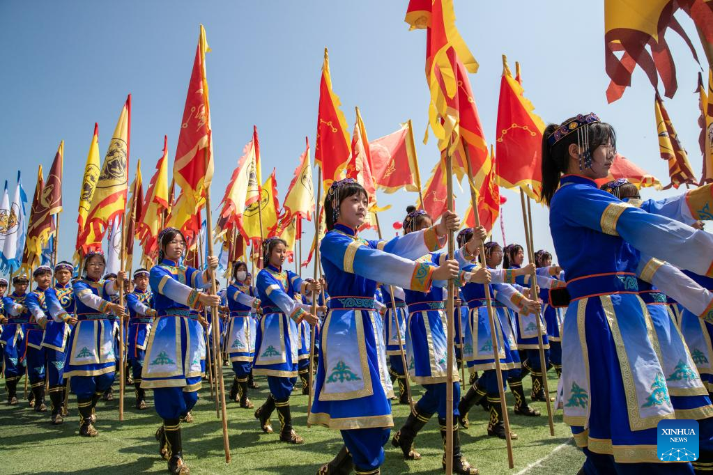 Students wearing Hezhe traditional costumes take part in the 11th Wurigong Festival of the Hezhe ethnic group in Fuyuan, northeast China's Heilongjiang Province, July 2, 2023. (Xinhua/Zhang Tao)