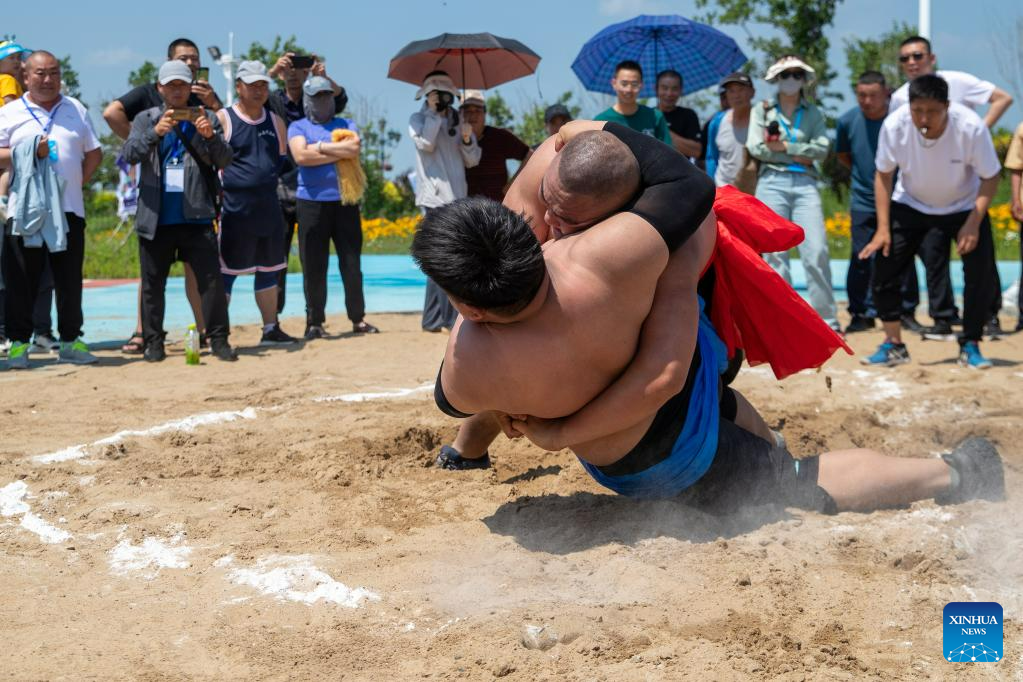 Hezhe people take part in a wrestling competition during the 11th Wurigong Festival of the Hezhe ethnic group in Fuyuan, northeast China's Heilongjiang Province, July 2, 2023. (Xinhua/Zhang Tao)