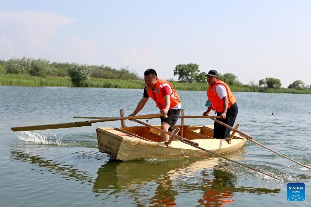 Hezhe people take part in a boat race during the 11th Wurigong Festival of the Hezhe ethnic group in Fuyuan, northeast China's Heilongjiang Province, July 2, 2023. (Xinhua/Shi Feng)