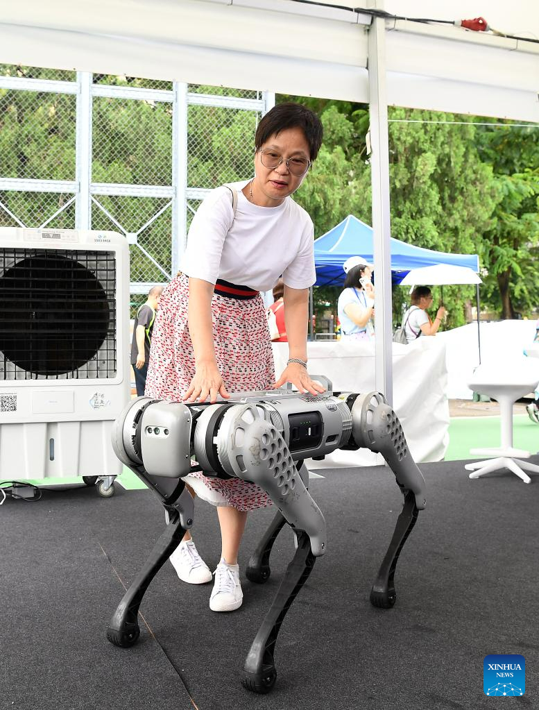 A woman interacts with a mechanical dog in Victoria Park of Hong Kong, south China, June 30, 2023. (Xinhua/Chen Duo)