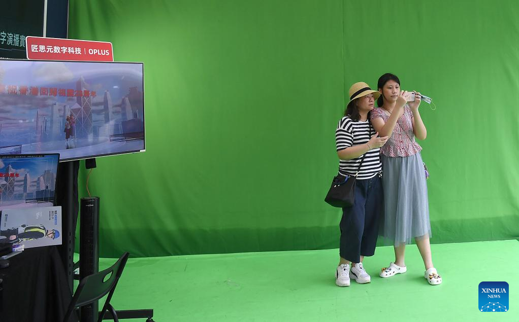 People try a virtual space technology at the booth of Meta Engine, a Guangzhou-based digital technology firm, in Victoria Park of Hong Kong, south China, July 1, 2023. (Xinhua/Chen Duo)