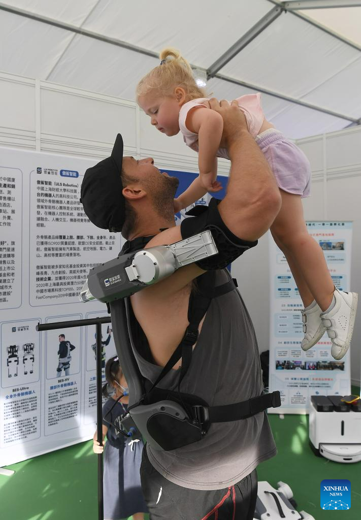HONG KONG, July 2 (Xinhua) -- Putting on an armor that looks much like a backpack, Hong Kong resident Kelvin Wong feels like Iron Man: the exoskeleton suit adds extra force to his arms and can help him lift objects as heavy as 30 kg. By his side, a mechanical dog just said "Hi!"