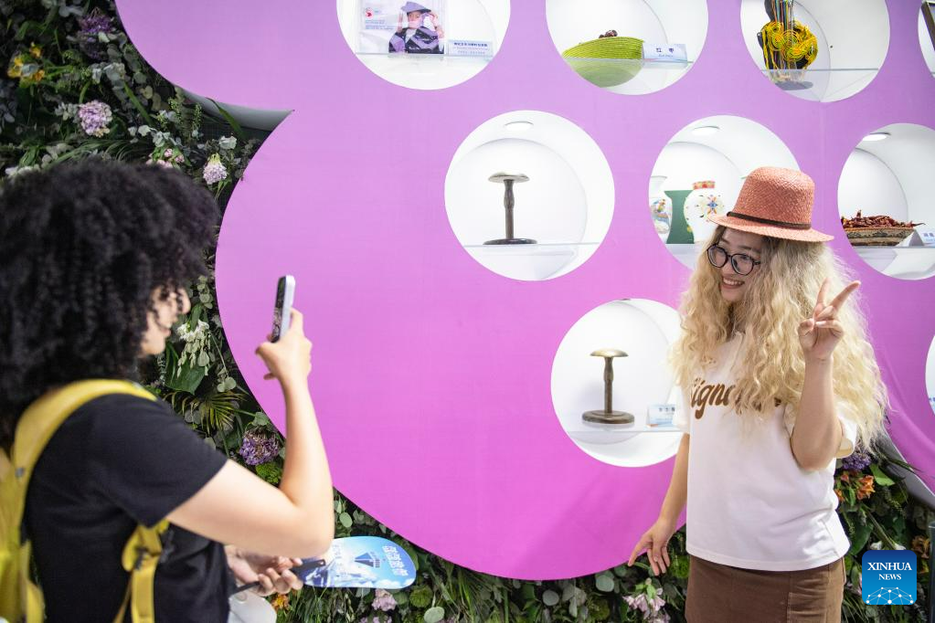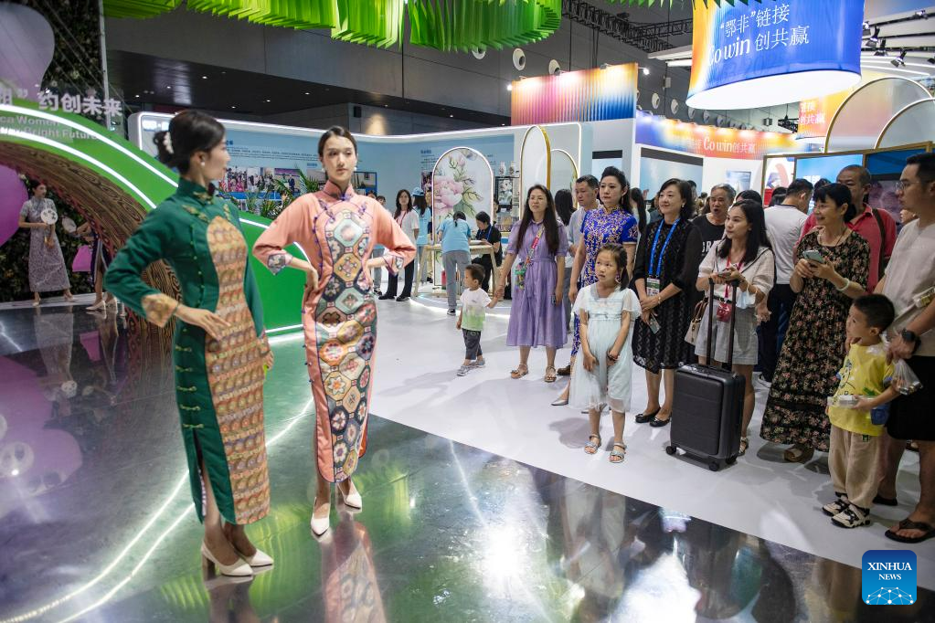 People visit the China-Africa Women's Innovation and Entrepreneurship Exhibition at the Changsha International Convention and Exhibition Center during the third China-Africa Economic and Trade Expo in Changsha, central China's Hunan Province, July 1, 2023. The third China-Africa Economic and Trade Expo is held in Changsha from June 29 to July 2. (Xinhua/Chen Yehua)