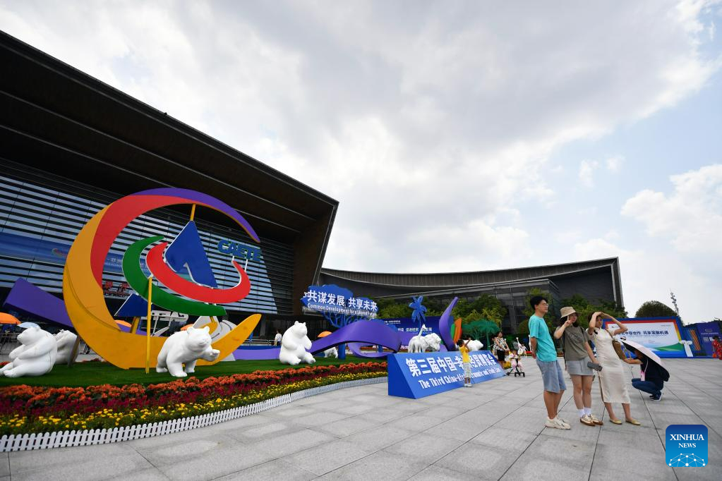 Visitors take photos in front of the Changsha International Convention and Exhibition Center during the third China-Africa Economic and Trade Expo in Changsha, central China's Hunan Province, July 1, 2023. The third China-Africa Economic and Trade Expo is held in Changsha from June 29 to July 2. (Xinhua/Chen Zhenhai)
