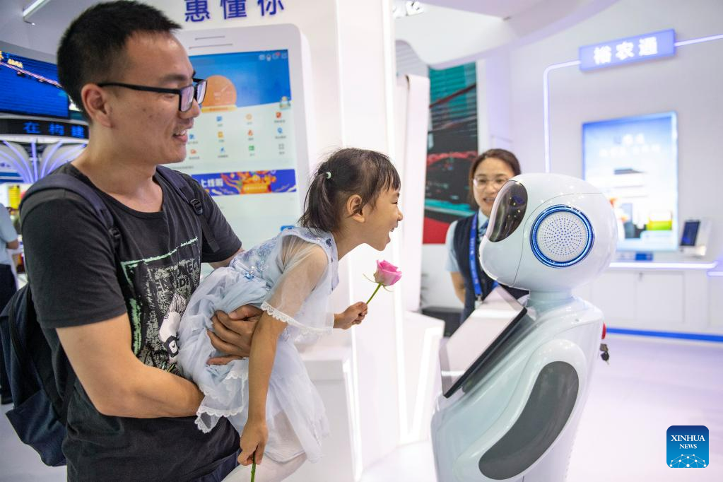 A girl interacts with a service robot during the third China-Africa Economic and Trade Expo in Changsha, central China's Hunan Province, July 1, 2023. The third China-Africa Economic and Trade Expo is held in Changsha from June 29 to July 2. (Xinhua/Sun Ruibo)