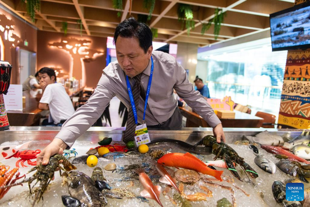 An exhibitor arranges African seafood products at the China-Africa Economic and Trade Cooperation Promotion Innovation Demonstration Park (Hunan Gaoqiao Grand Market) in Changsha, central China's Hunan Province, July 1, 2023. The third China-Africa Economic and Trade Expo is held in Changsha from June 29 to July 2. (Xinhua/Chen Sihan)