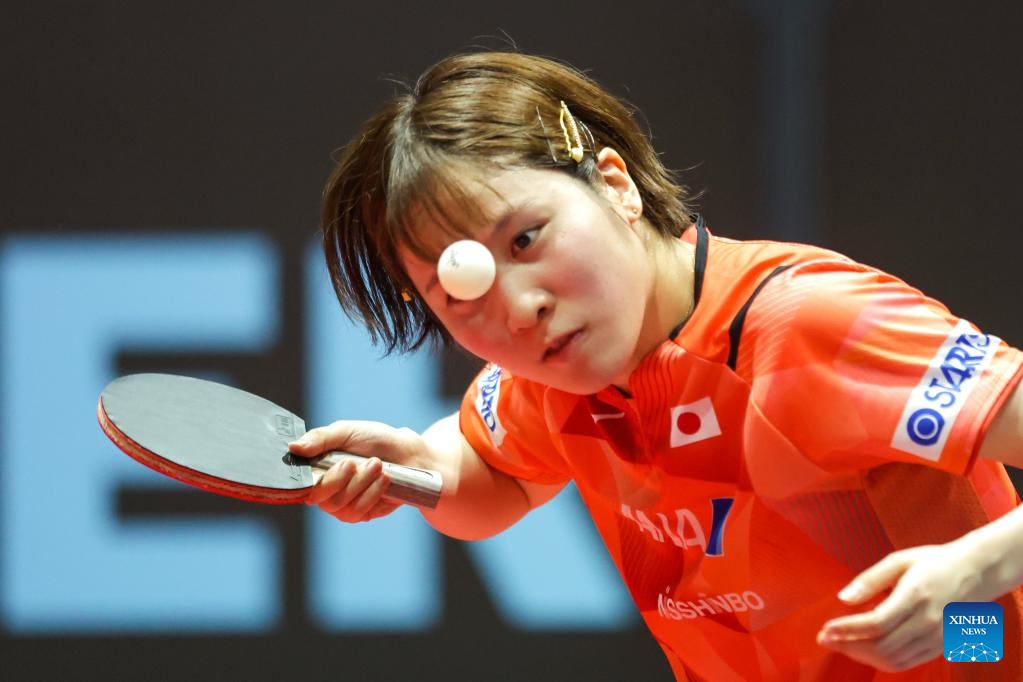 Miu Hirano of Japan serves during women's singles semifinal match against Kuai Man of China at the 2023 World Table Tennis (WTT) Contender Zagreb in Zagreb, Croatia, on July 1, 2023. (Photo by Luka Stanzl/PIXSELL via Xinhua)