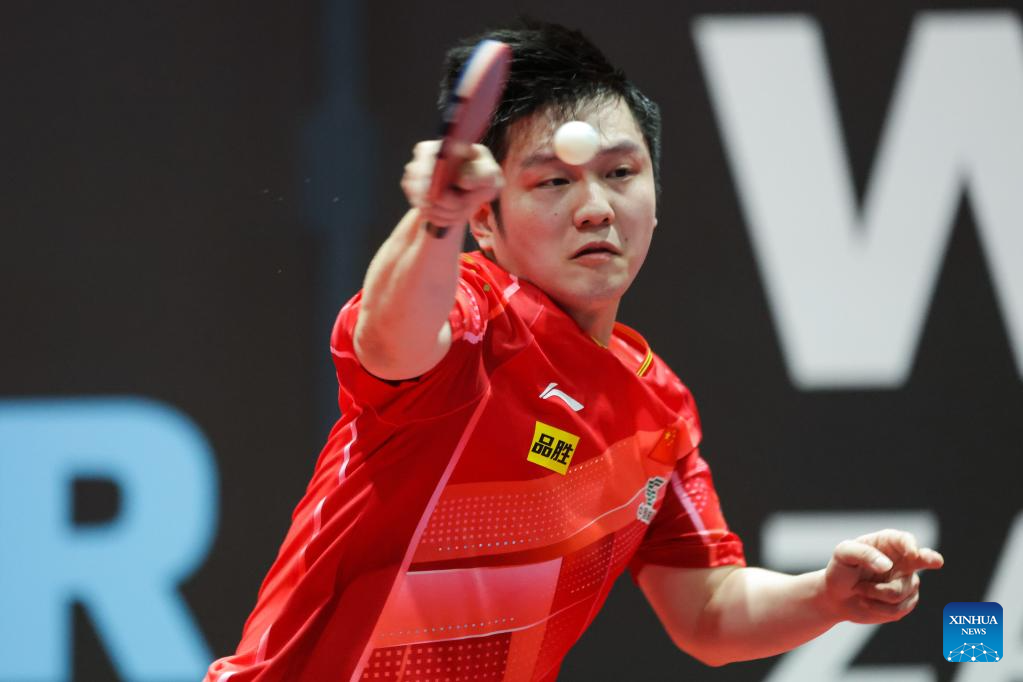 Fan Zhendong of China competes during men's singles semifinal match against his teammate Lin Shidong at the 2023 World Table Tennis (WTT) Contender Zagreb in Zagreb, Croatia, on July 1, 2023. (Photo by Luka Stanzl/PIXSELL via Xinhua)