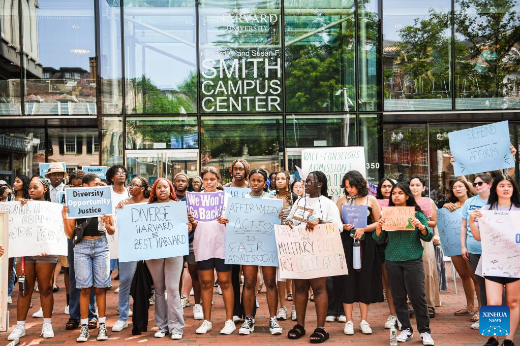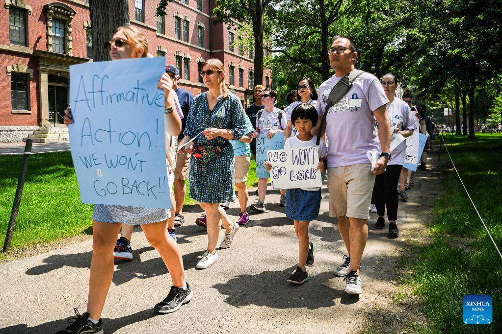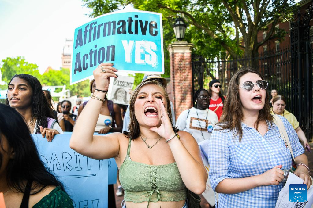 Participants march and chant slogans at a rally protesting the Supreme Court's ruling against affirmative action on Harvard University Campus in Cambridge, Massachusetts, the United States, on July 1, 2023. (Photo by Ziyu Julian Zhu/Xinhua)