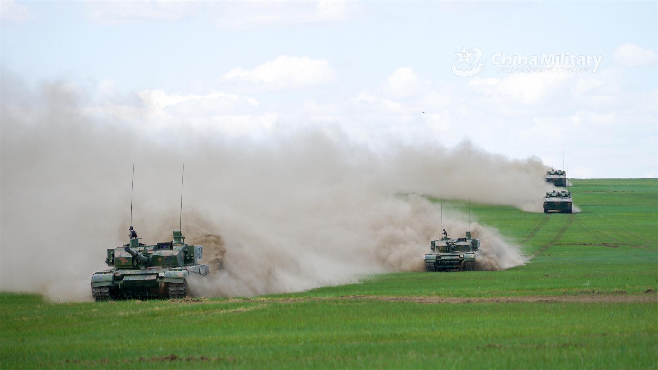 Main battle tanks (MBTs) attached to a brigade under the PLA 82nd Group Army kick up plumes of dust as they move forward to the designated area during a maneuvering training exercise in the Gobi desert in late June, 2023. (eng.chinamil.com.cn/Photo by Sun Tongkai)