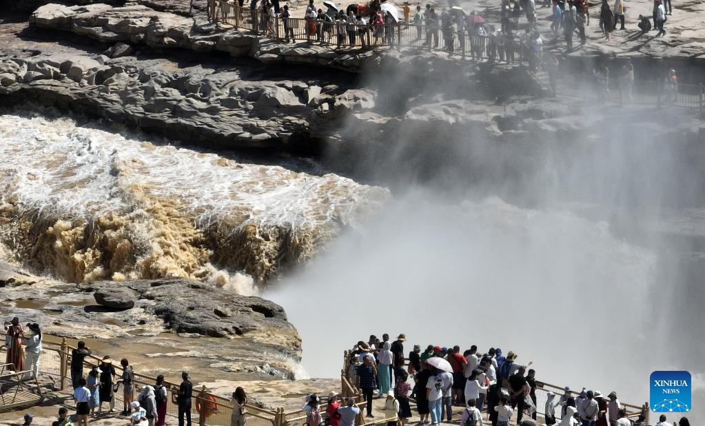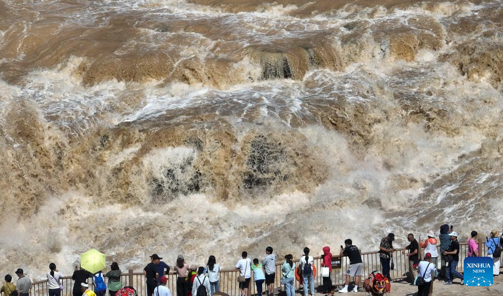 This aerial photo taken on July 3, 2023 shows tourists viewing the scenery of the Hukou Waterfall on the Yellow River, on the border area between north China's Shanxi and northwest China's Shaanxi provinces. (Photo by Zhang Lan/Xinhua)