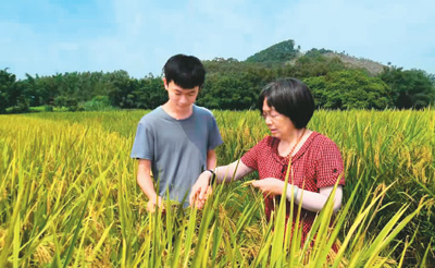 Chen Guanhai (left), an agricultural digital technician, and Zou Xiangjun, a professor at South China Agricultural University, check the growth of rice in a rice field. (Photo courtesy of the interviewee)