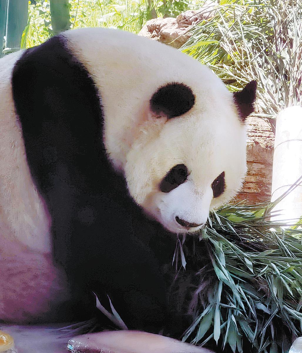 Giant panda Meng Lan chomps on bamboo leaves as he celebrates his eighth birthday at Beijing Zoo on Tuesday. [Photo by Wang Jing / China Daily]