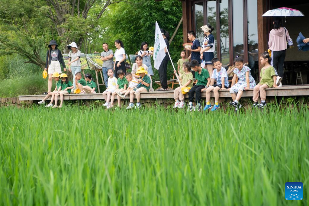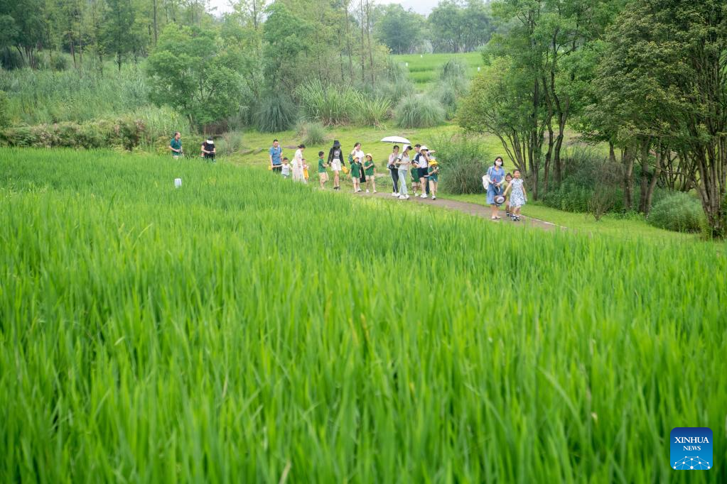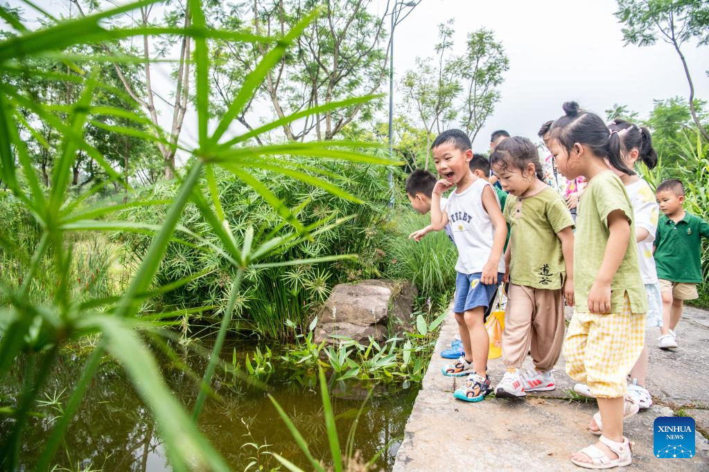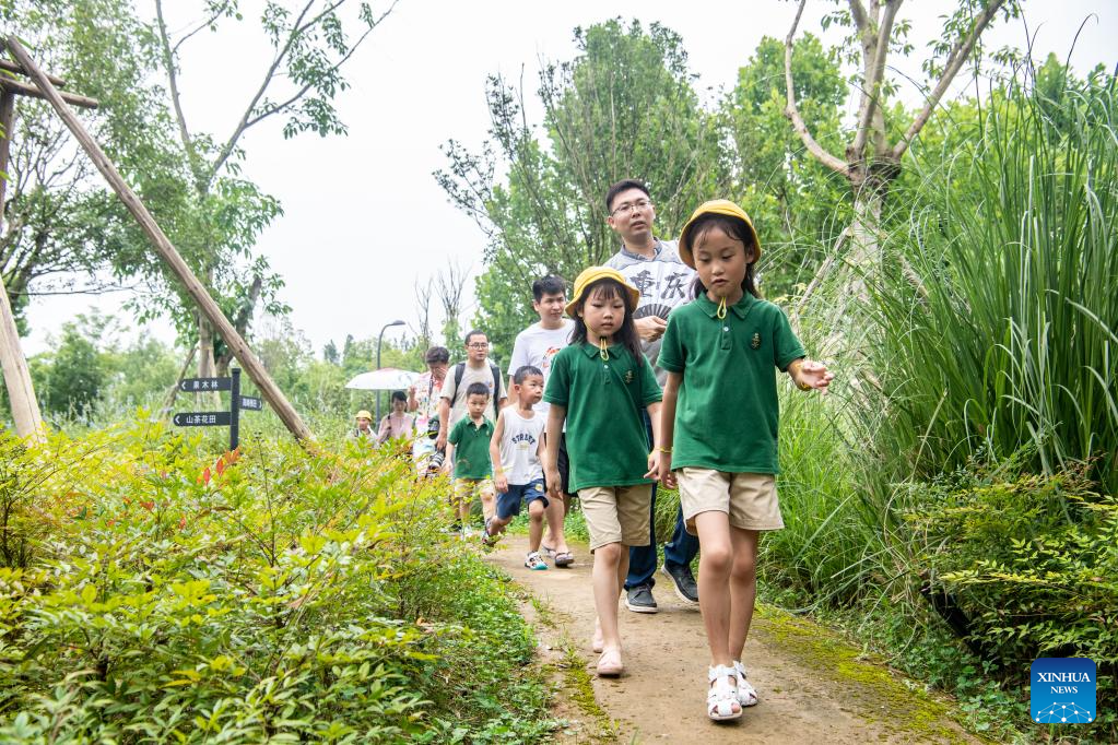 Parents and children visit Guangyang Isle for an ecological education tour in southwest China's Chongqing, July 3, 2023. (Xinhua/Tang Yi)