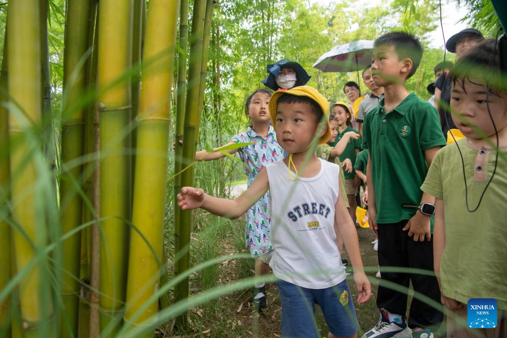 Children learn to identify plants during an ecological education tour on Guangyang Isle in southwest China's Chongqing, July 3, 2023. (Xinhua/Tang Yi)