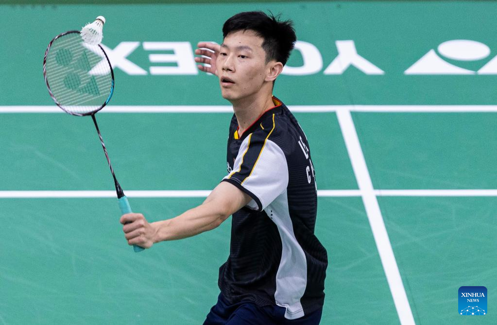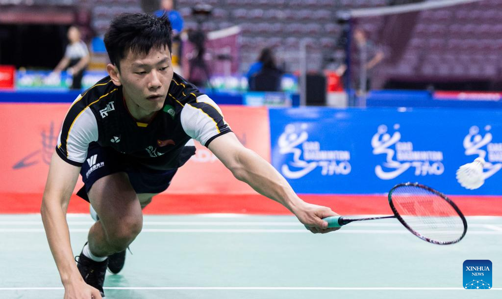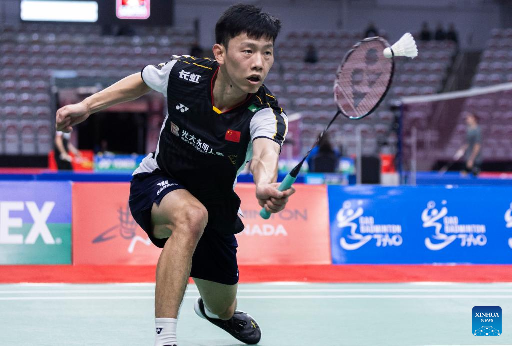 Lei Lanxi of China returns a shot during the second round of men's singles qualification match against Kashyap Parupalli of India at the 2023 Canada Open badminton tournament in Calgary, Canada, on July 4, 2023. (Photo by Zou Zheng/Xinhua)