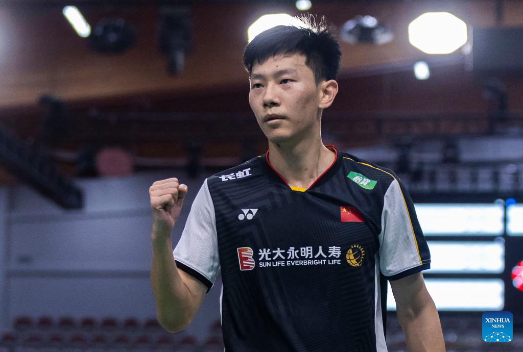 Lei Lanxi of China celebrates scoring during the second round of men's singles qualification match against Kashyap Parupalli of India at the 2023 Canada Open badminton tournament in Calgary, Canada, on July 4, 2023. (Photo by Zou Zheng/Xinhua)