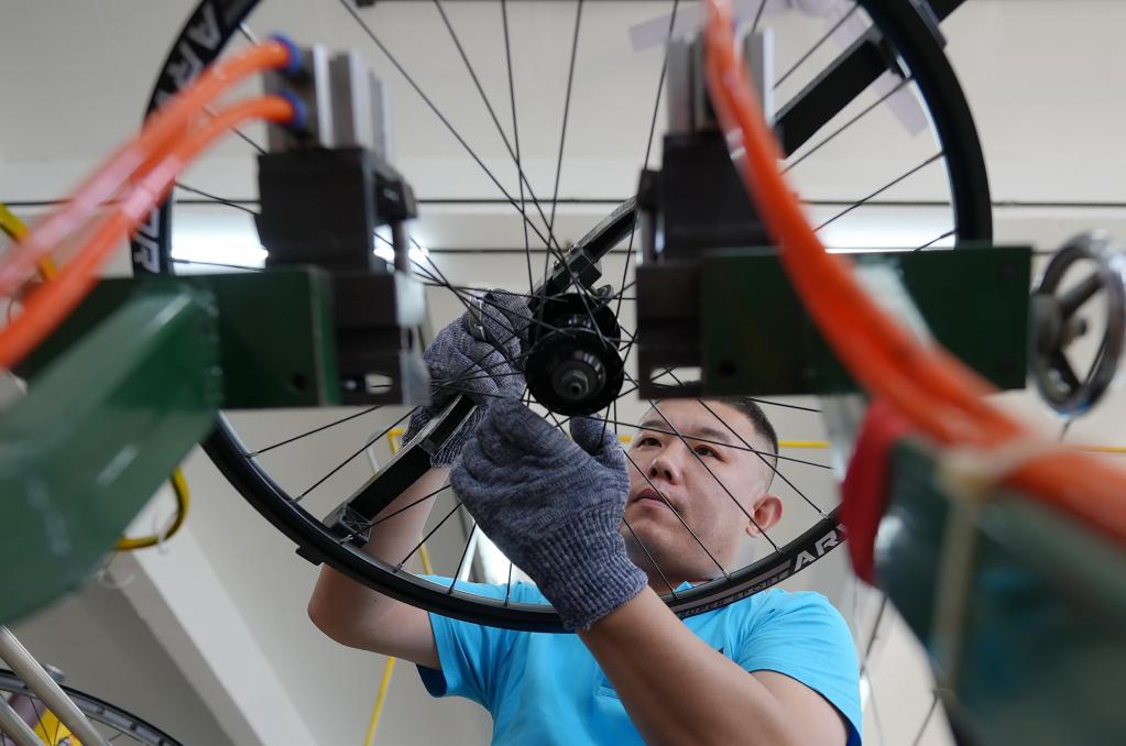 A staff member works at a workshop of a company producing bicycle components in Lutai Economic Development Zone of Tangshan City, north China's Hebei Province, June 25, 2023. Lutai Economic Development Zone has upgraded its bicycle manufacturing sector and contributed to high-quality development in the regional economy in recent years. The annual output of the 46 bike-related enterprises in the zone has reached 5.5 billion yuan (about 761 million U.S. dollars). (Xinhua/Yang Shiyao)