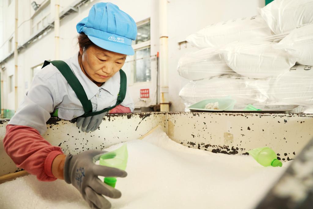 An employee works at a company in Tengzhou City, east China's Shandong Province, June 30, 2023. In recent years, Dongguo Town of Tengzhou City has promoted high-quality development by accelerating the transformation of growth drivers and made efforts to create a favorable business environment for the private sector. Silica cat litter produced by private enterprises have been exported to over 80 countries and regions including the United States, Canada and Germany. (Xinhua/Fan Changguo)
