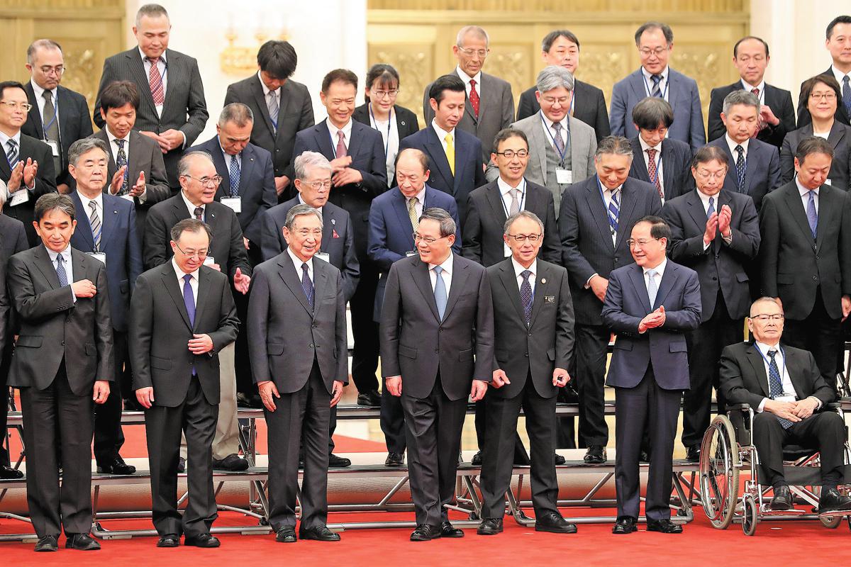 Premier Li Qiang (front, center) takes a group photo with a visiting business delegation led by Yohei Kono (front, second left), president of the Japanese Association for the Promotion of International Trade, at the Great Hall of the People in Beijing on Wednesday. [Photo by Wang Zhuangfei / China Daily]