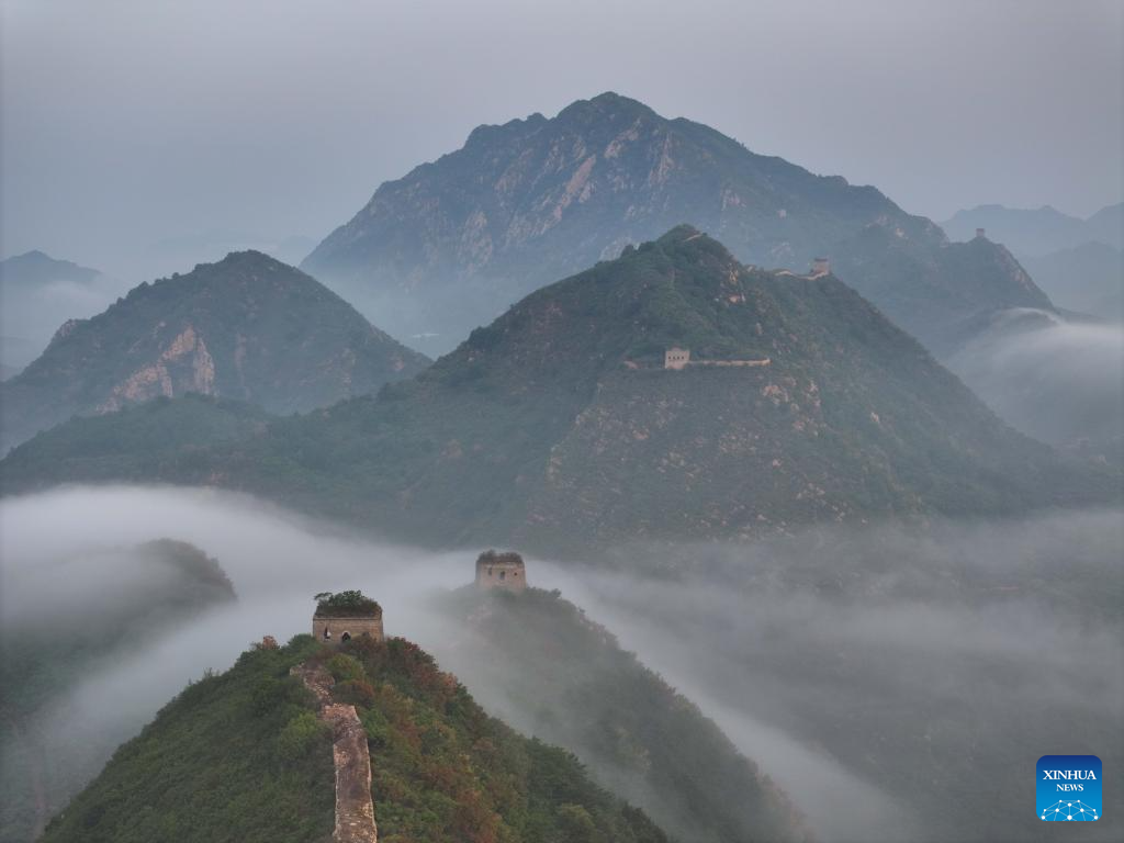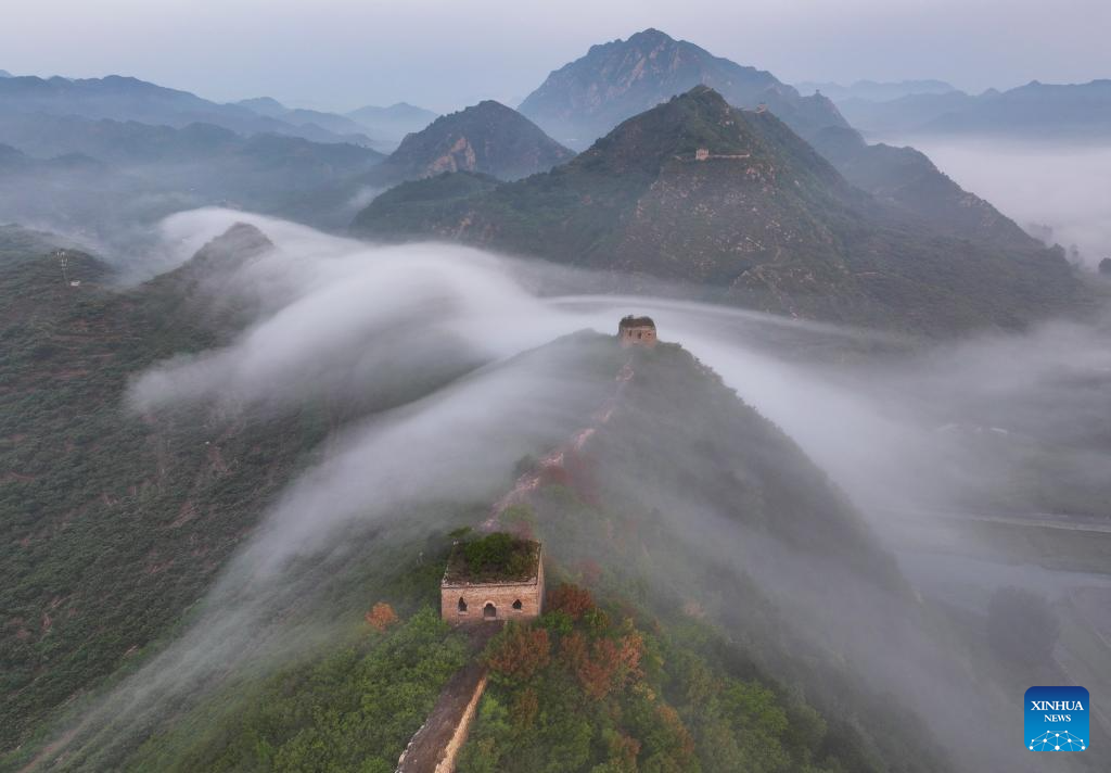 This aerial photo taken on July 5, 2023 shows the Dongjiakou Great Wall shrouded in fog in Qianxi County of Tangshan, north China's Hebei Province. (Photo by Wang Aijun/Xinhua)
