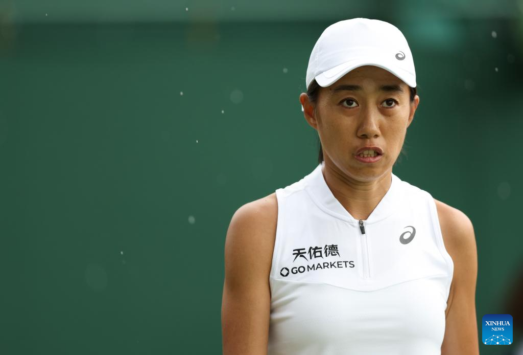 Zhang Shuai looks up during the women's singles first round match between Zhang Shuai of China and Donna Vekic of Croatia at Wimbledon Tennis Championships in London, Britain, July 5, 2023. (Xinhua/Han Yan)