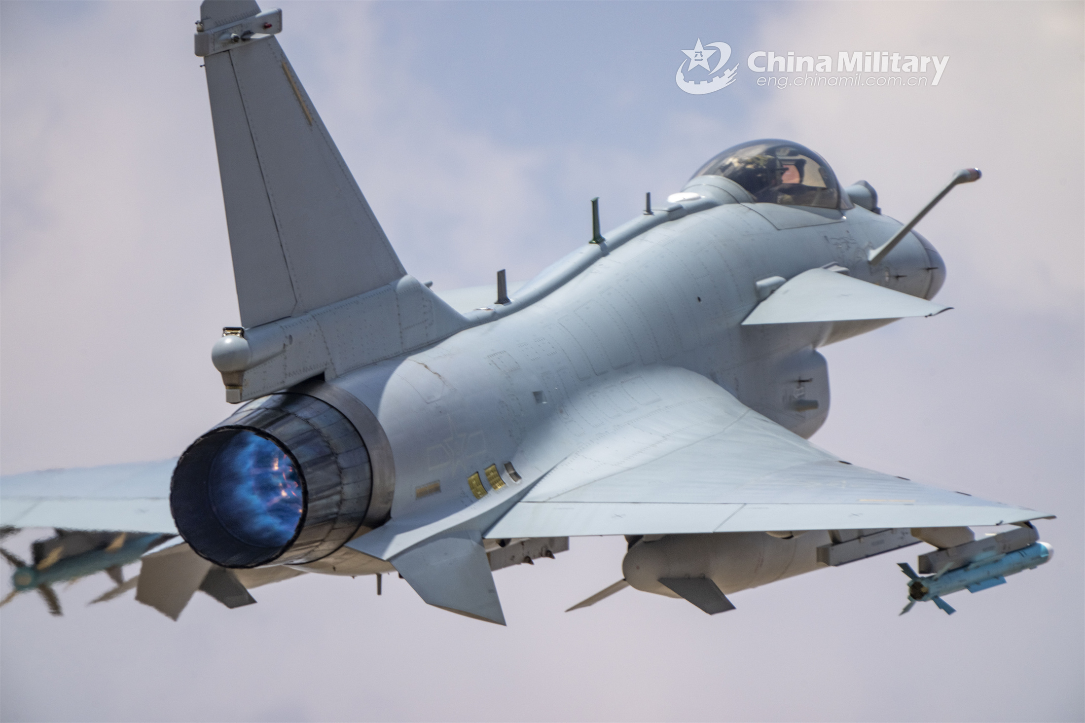 A J-10 fighter jet attached to an aviation brigade of the air force under the PLA Southern Theater Command soars through the sky on its way to a designated airspace during a recent flight training exercise. (eng.chinamil.com.cn/Photo by Wang Guoyun)