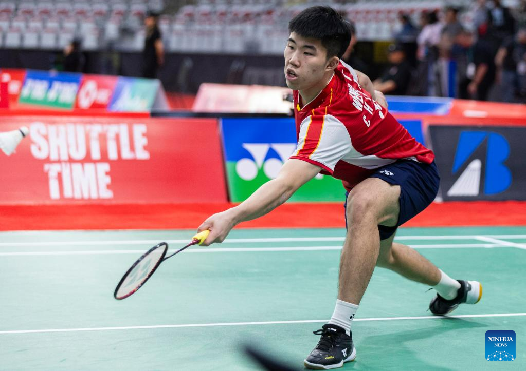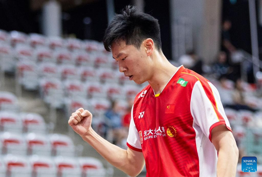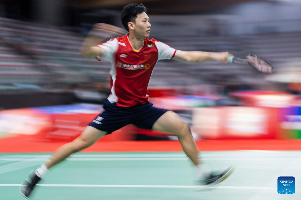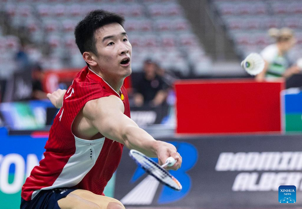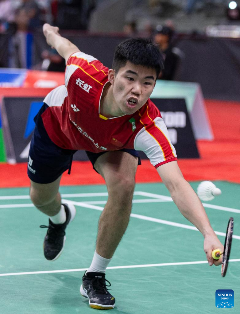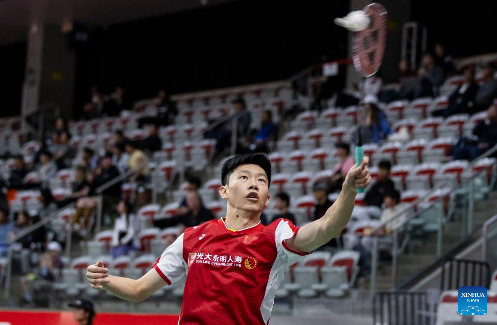 Lei Lanxi of China returns a shot during the first round of men's singles match against Kantaphon Wangcharoen of Thailand at the 2023 Canada Open badminton tournament in Calgary, Canada, on July 5, 2023. (Photo by Zou Zheng/Xinhua)