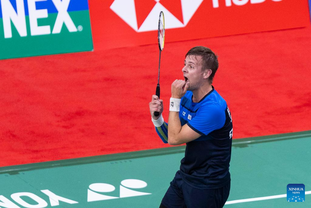 Hans-Kristian Solberg Vittinghus of Denmark reacts during the first round of men's singles match against Li Shifeng of China at the 2023 Canada Open badminton tournament in Calgary, Canada, on July 5, 2023. (Photo by Zou Zheng/Xinhua)