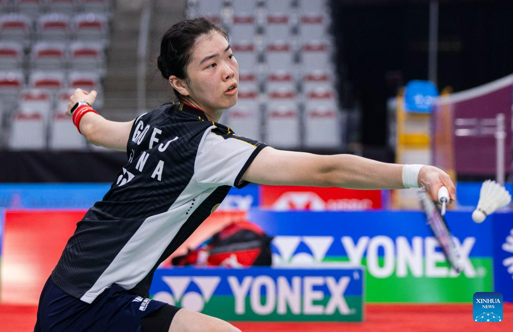 Gao Fangjie of China returns a shot during the first round of women's singles match against Line Christophersen of Denmark at the 2023 Canada Open badminton tournament in Calgary, Canada, on July 5, 2023. (Photo by Zou Zheng/Xinhua)