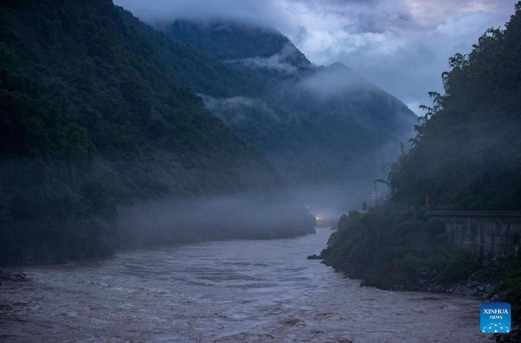 This photo taken on July 4, 2023 shows car lights looming in fog on a section of G219 national highway along the Nujiang River in Nujiang Lisu Autonomous Prefecture, southwest China's Yunnan Province. (Xinhua/Yang Zhisen)