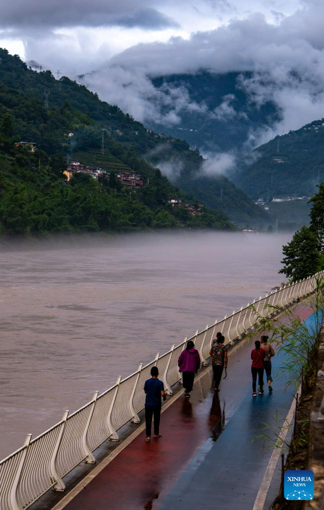 Residents stroll on a walkway along the Nujiang River in Nujiang Lisu Autonomous Prefecture, southwest China's Yunnan Province, on July 4, 2023. (Xinhua/Jiang Wenyao)