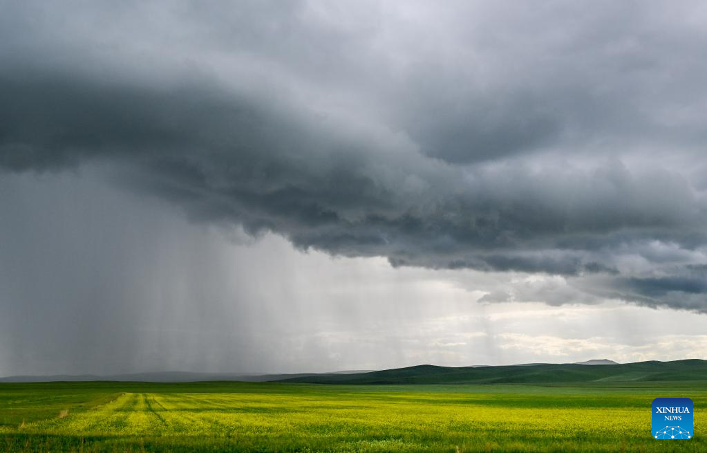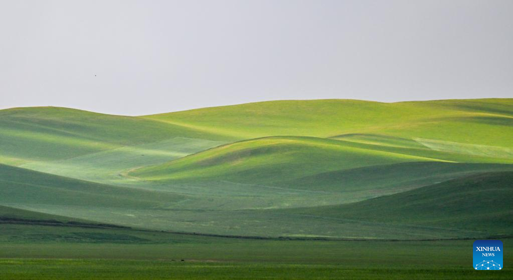 This photo taken on July 5, 2023 shows the scenery of the grassland in Holin Gol, north China's Inner Mongolia Autonomous Region. The picturesque grassland in Holin Gol, located at the intersection of Horqin Grassland, Xilin Gol Grassland and Hulunbuir Grassland, is one of the primitive grasslands in Inner Mongolia Autonomous Region. (Xinhua/Lian Zhen)