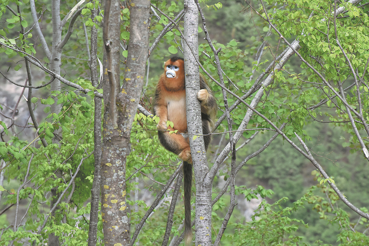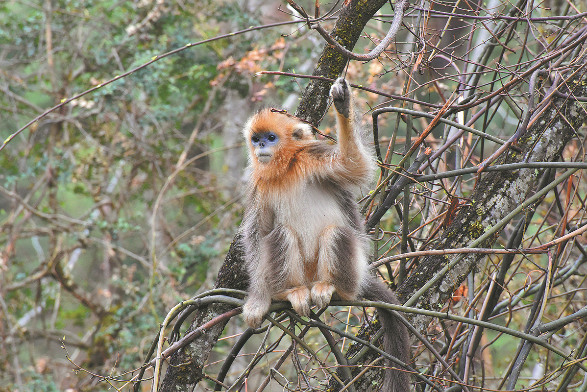 Golden monkey Yuli, who was named by Tang Yulin, sits on a branch. TANG YULIN/FOR CHINA DAILY
