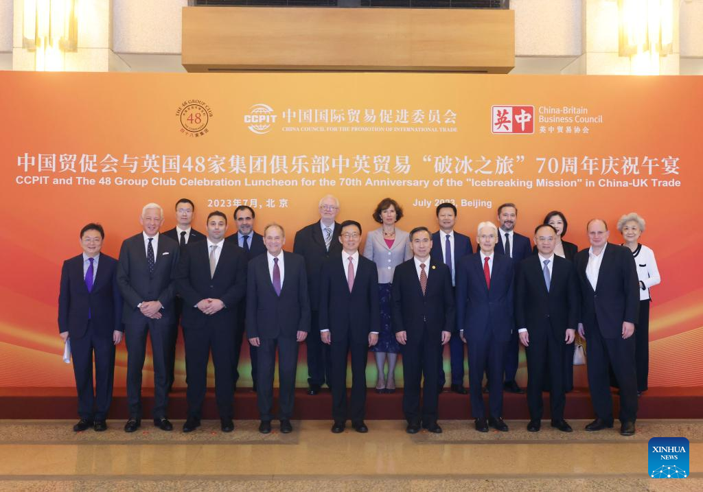 Chinese Vice President Han Zheng poses for a group photo with some guests while attending an event commemorating the 70th anniversary of the "Icebreaking Mission" in China-UK trade, where he reads out a congratulatory letter sent by Chinese President Xi Jinping to the event, in Beijing, capital of China, July 6, 2023. (Xinhua/Liu Weibing)