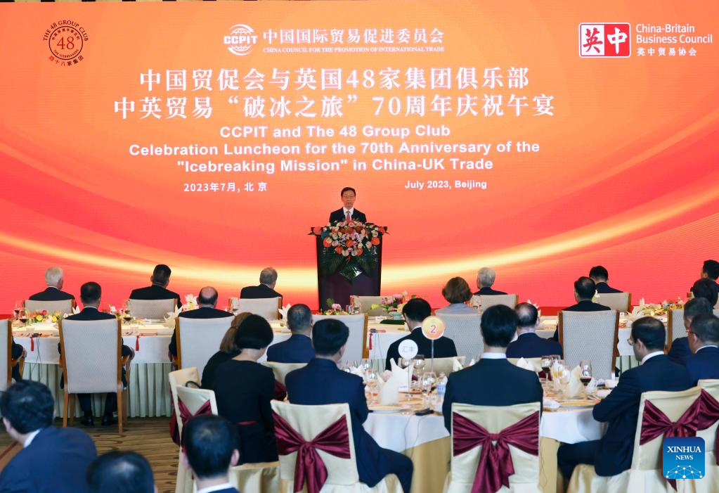 Chinese Vice President Han Zheng attends an event commemorating the 70th anniversary of the "Icebreaking Mission" in China-UK trade, where he reads out a congratulatory letter sent by Chinese President Xi Jinping to the event, in Beijing, capital of China, July 6, 2023. (Xinhua/Liu Weibing)