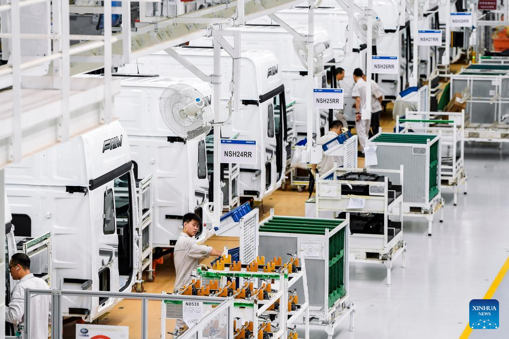 This photo taken on June 27, 2023 shows a worker checking an assembled truck at an intelligent plant of truck manufacturer First Automotive Works Jiefang Co., Ltd. (FAW Jiefang) in Changchun, northeast China's Jilin Province. (Xinhua/Xu Chang)