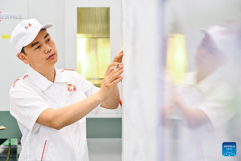 This photo taken on June 8, 2023 shows Yang Yongxiu (R), a senior technician at the FAW Group Corporation R&D Center, conducting precision measurement of trial parts in Changchun, northeast China's Jilin Province. (Xinhua/Xu Chang)