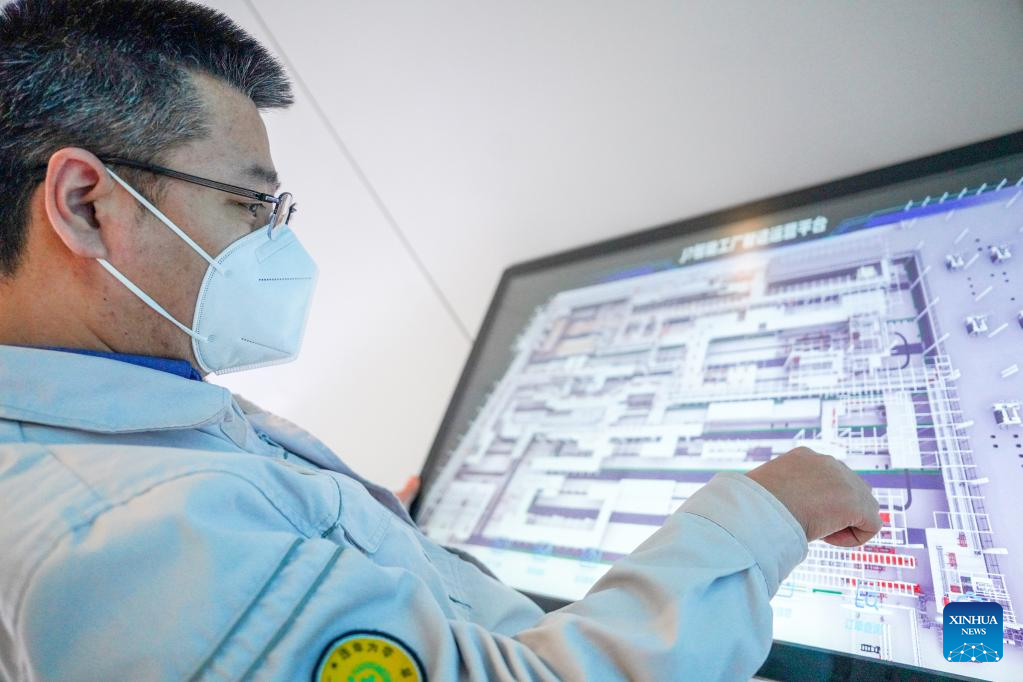 This photo taken on Dec. 27, 2022 shows workshop director Wang Yiqiang checking the truck manufacturing process with an electronic screen at an intelligent plant of truck manufacturer First Automotive Works Jiefang Co., Ltd. (FAW Jiefang) in Changchun, northeast China's Jilin Province. (Xinhua/Yan Linyun)