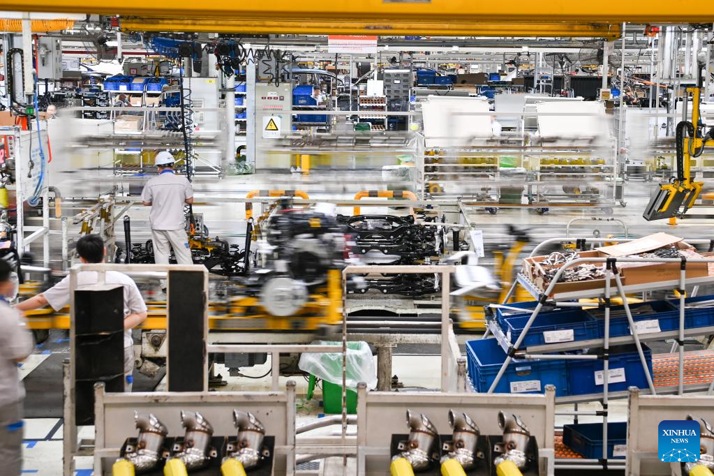 This photo taken on June 27, 2023 shows workers assembling automobiles at an intelligent plant of truck manufacturer First Automotive Works Jiefang Co., Ltd. (FAW Jiefang) in Changchun, northeast China's Jilin Province. (Xinhua/Xu Chang)