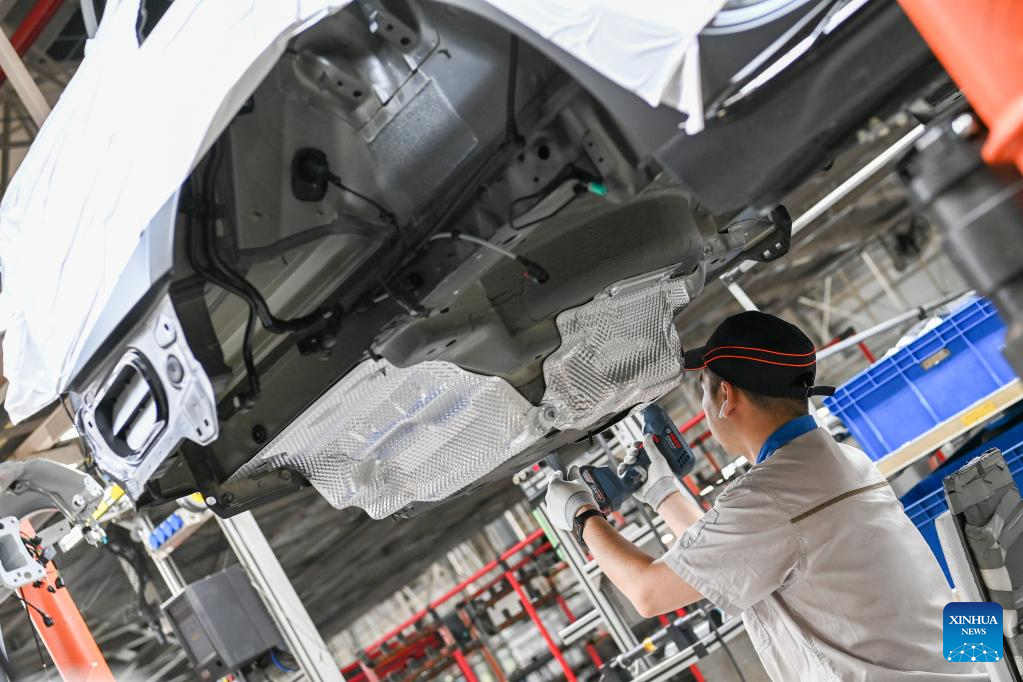 This photo taken on June 12, 2023 shows a worker assembling vehicles at the general assembly line of FAW-Volkswagen in Changchun, northeast China's Jilin Province. (Xinhua/Yan Linyun)