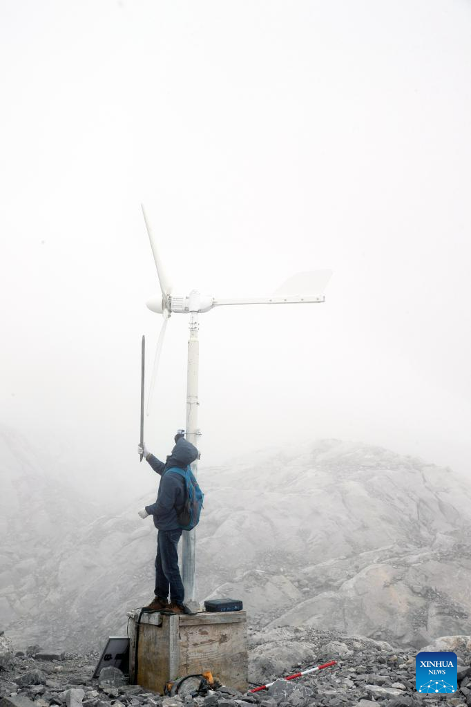 Wang Shijin (1st L) checks the equipment with his teammates at a meteorological observation station on the Yulong Snow Mountain in Lijiang City, southwest China's Yunnan Province, June 19, 2023. (Xinhua/Zhang Cheng)
