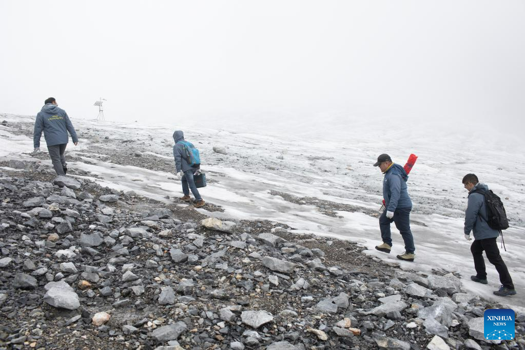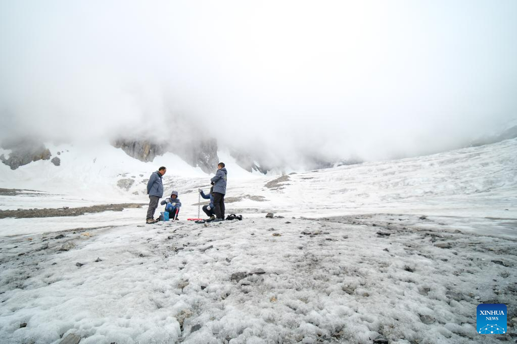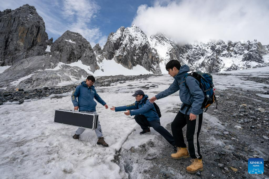 Wang Shijin (1st L) works with his teammates on the Baishui River No. 1 Glacier on the Yulong Snow Mountain in Lijiang City, southwest China's Yunnan Province, June 19, 2023. (Xinhua/Zhang Cheng)