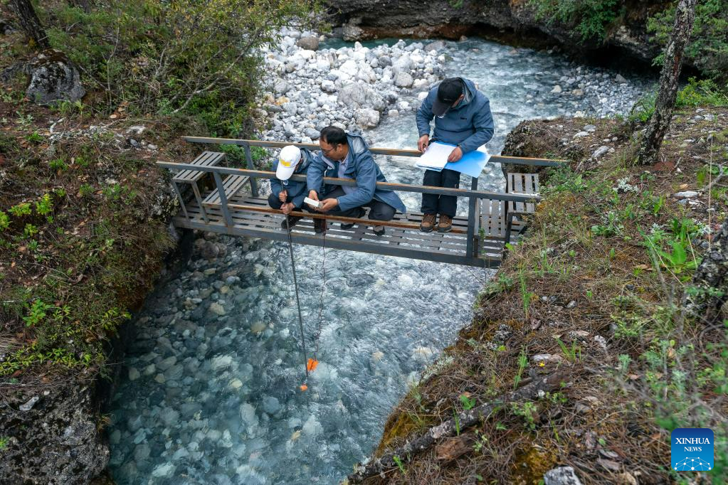 Wang Shijin (C) measures the flow velocity of glacier meltwater with his teammates at an observation point along the Baishui River in Lijiang City, southwest China's Yunnan Province, June 16, 2023. (Xinhua/Chen Xinbo)