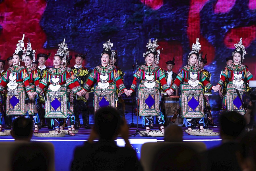 Artists sing songs of Dong ethnic group at the closing ceremony of the Eco Forum Global Guiyang 2023 in Guiyang, southwest China's Guizhou Province, July 9, 2023. (Xinhua/Yang Wenbin)