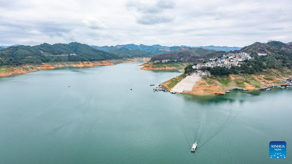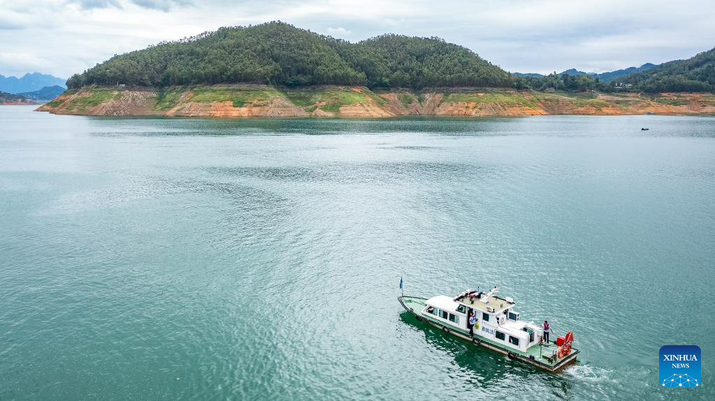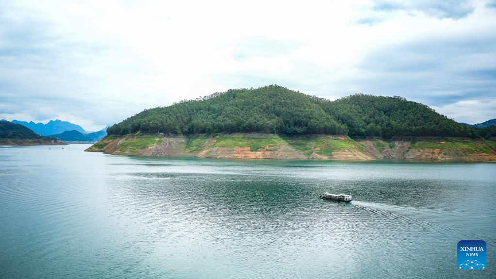 This photo taken on July 5, 2023 shows a boat sailing on Wanfeng Lake in Nanpan river town of Xingyi City in southwest China's Guizhou Province. Covering an area of 176 square kilometer, the Wanfeng Lake serves as an important ecological barrier to Pearl River Delta region. The local authority has taken proactive measures to tackle pollution and improve the water quality here. (Xinhua/Tao Liang)