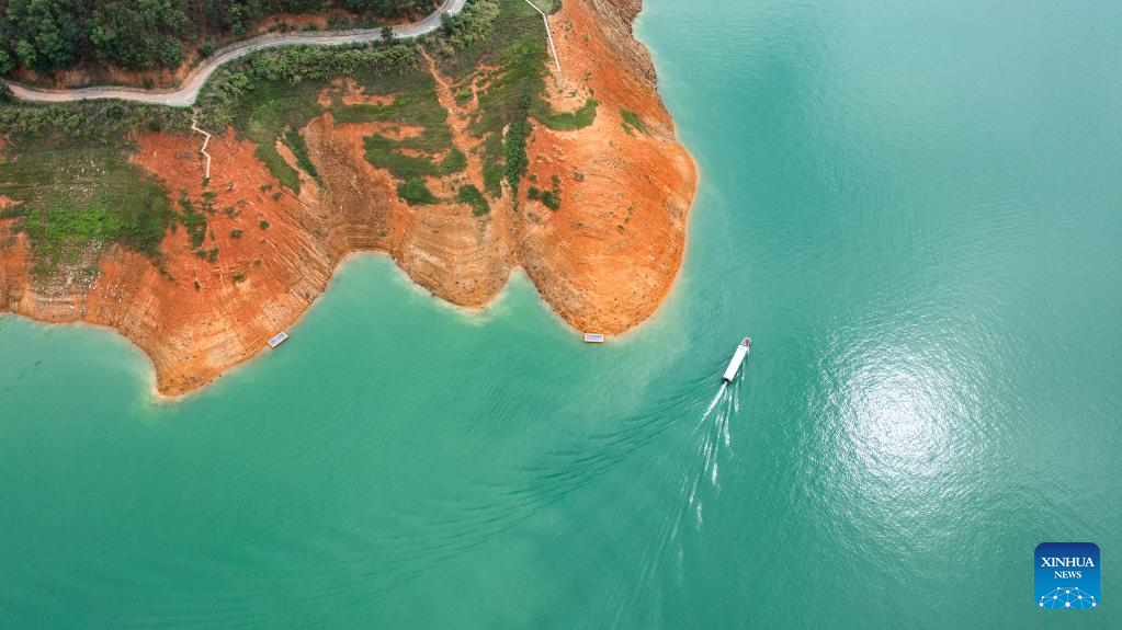 This aerial photo taken on July 4, 2023 shows a boat sailing on Wanfeng Lake in Nanpan river town of Xingyi City in southwest China's Guizhou Province. Covering an area of 176 square kilometer, the Wanfeng Lake serves as an important ecological barrier to Pearl River Delta region. The local authority has taken proactive measures to tackle pollution and improve the water quality here. (Xinhua/Tao Liang)