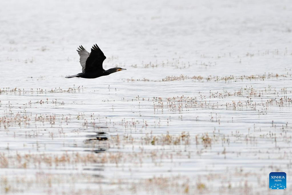 A cormorant flies over the Gahai Lake wetland in Luqu County of the Tibetan Autonomous Prefecture of Gannan, northwest China's Gansu Province, July 7, 2023. (Xinhua/Chen Bin)
