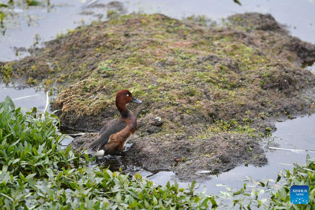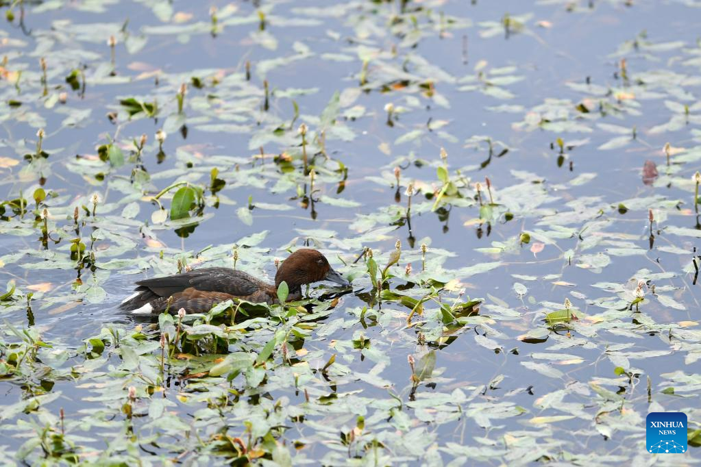 A ferruginous duck is pictured in the Gahai Lake wetland in Luqu County of the Tibetan Autonomous Prefecture of Gannan, northwest China's Gansu Province, July 7, 2023. (Xinhua/Fang Xin)